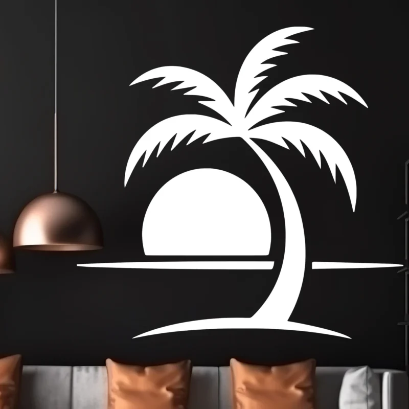 This design brings a calm tropical feel into your space without adding clutter. The curved palm and setting sun create a soft focal point that naturally draws the eye across the wall.